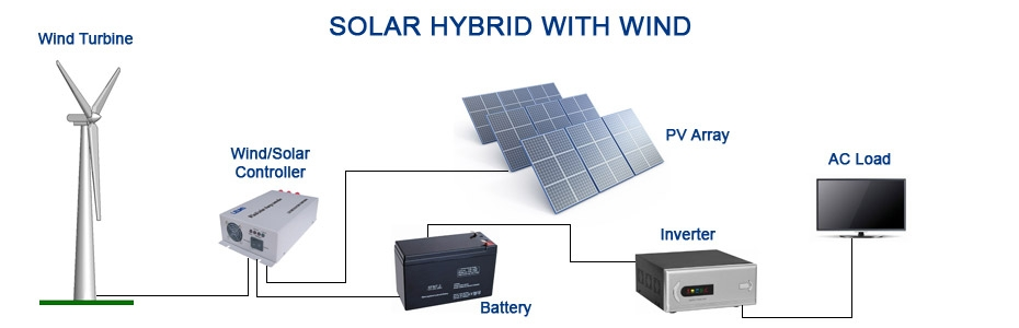 Solar & Wind are used in conjunction for generating power in our hybrid system. The combination of renewable energy sources, wind & solar when used for generating power in conjunction is called as Wind-Solar hybrid system. This system is designed using the solar panels and small wind turbines generators for generating electricity.